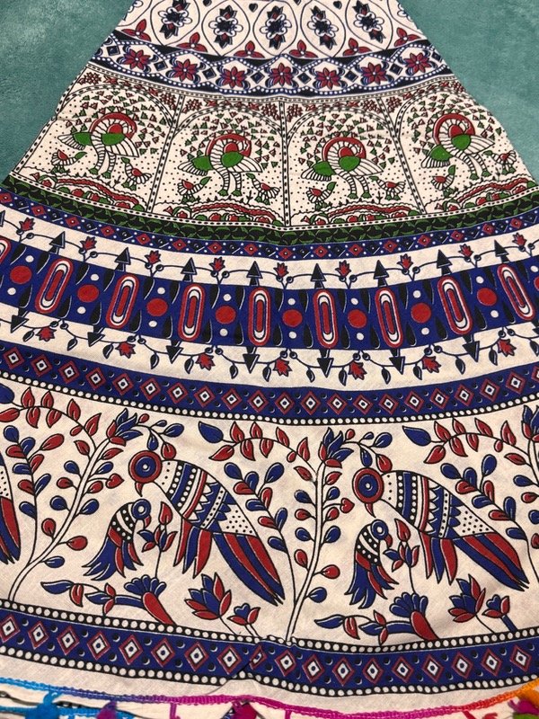 Manta circular con pompones en el borde, los colores son fondo blanco, verde, azul, rojo y negro, las medidas son aproximadas desde 1,70 a 1,80 de diámetro según como fue hecho el corte.