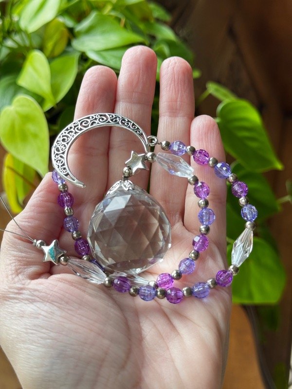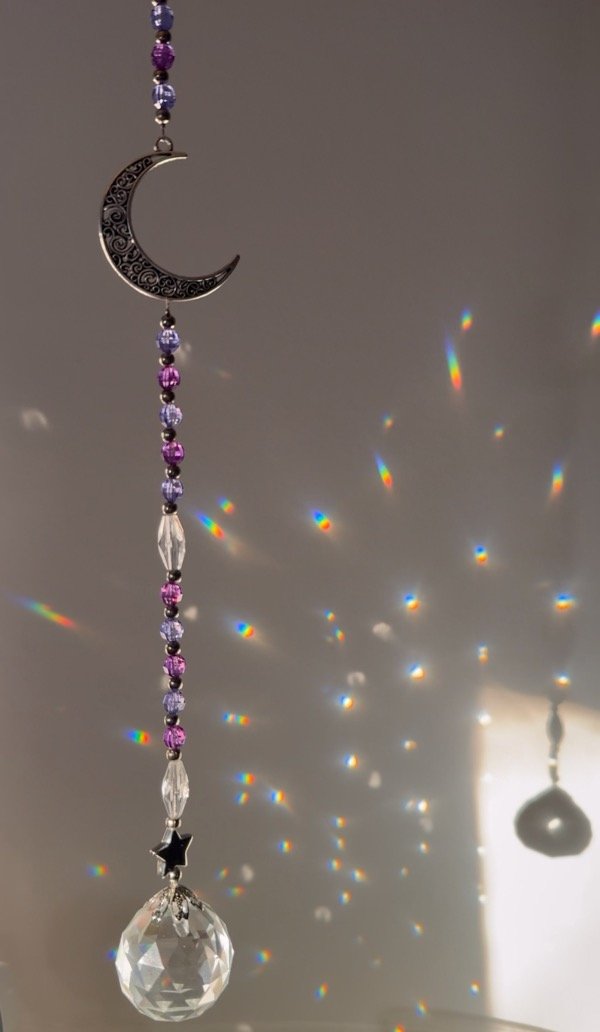 Tira con luna, accesorios en acrílico y esfera grande de cristal. Miden aproximadamente 45 cm