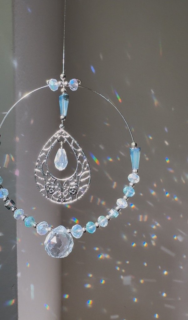 Colgante circular con accesorio de gota en el centro, de puro cristal. Mide de largo aproximadamente 60 cm en total